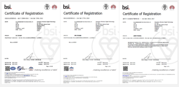 近日,海康威視正式獲得由國際**標(biāo)準(zhǔn)研發(fā)和認(rèn)證評審機(jī)構(gòu)英國標(biāo)準(zhǔn)協(xié)會(BSI)頒發(fā)的ISO/IEC 27701:2019及ISO/IEC 29151:2017體系認(rèn)證,意味著海康威視所建立的隱私信息管理···